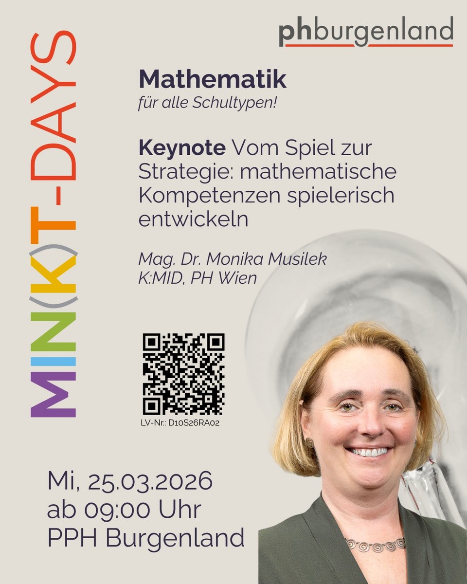 Die MIN(K)T-Days 2026 an der Privaten Pädagogischen Hochschule Burgenland, die am 24. und 25. März stattfinden, bieten zwei thematische Schwerpunkttage mit fundierten Keynotes und praxisnahen Workshops für einen zeitgemäßen Unterricht in Mathematik und den Naturwissenschaften. Ziel der Veranstaltung ist die Verknüpfung aktueller Forschungsergebnisse mit der schulischen Praxis, um eine kompetenzorientierte Gestaltung des MINT-Unterrichts zu unterstützen. Eine Nachmeldung für die Teilnehmenden ist weiterhin möglich.